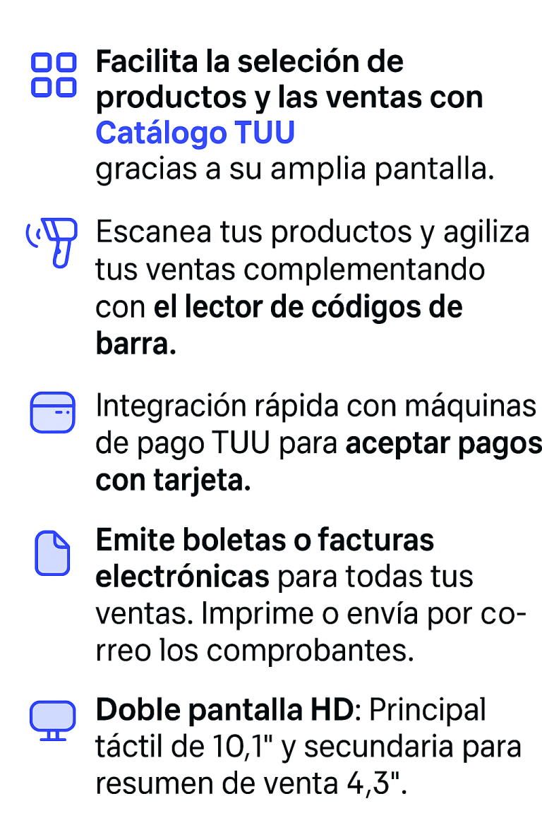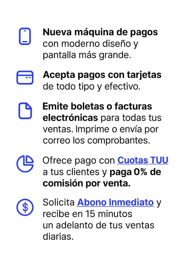 Simplifica tu negocio con TUU, la máquina inteligente que imprime boletas y facturas electrónicas, acepta pagos con chip, banda magnética, contactless, Google Pay y Apple Pay. Sin necesidad de múltiples equipos ni instalaciones complicadas. Todo lo que necesitas, en la palma de tu mano.